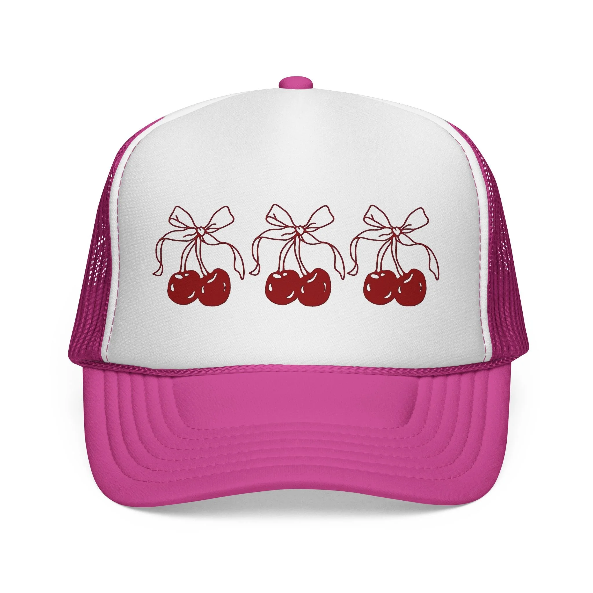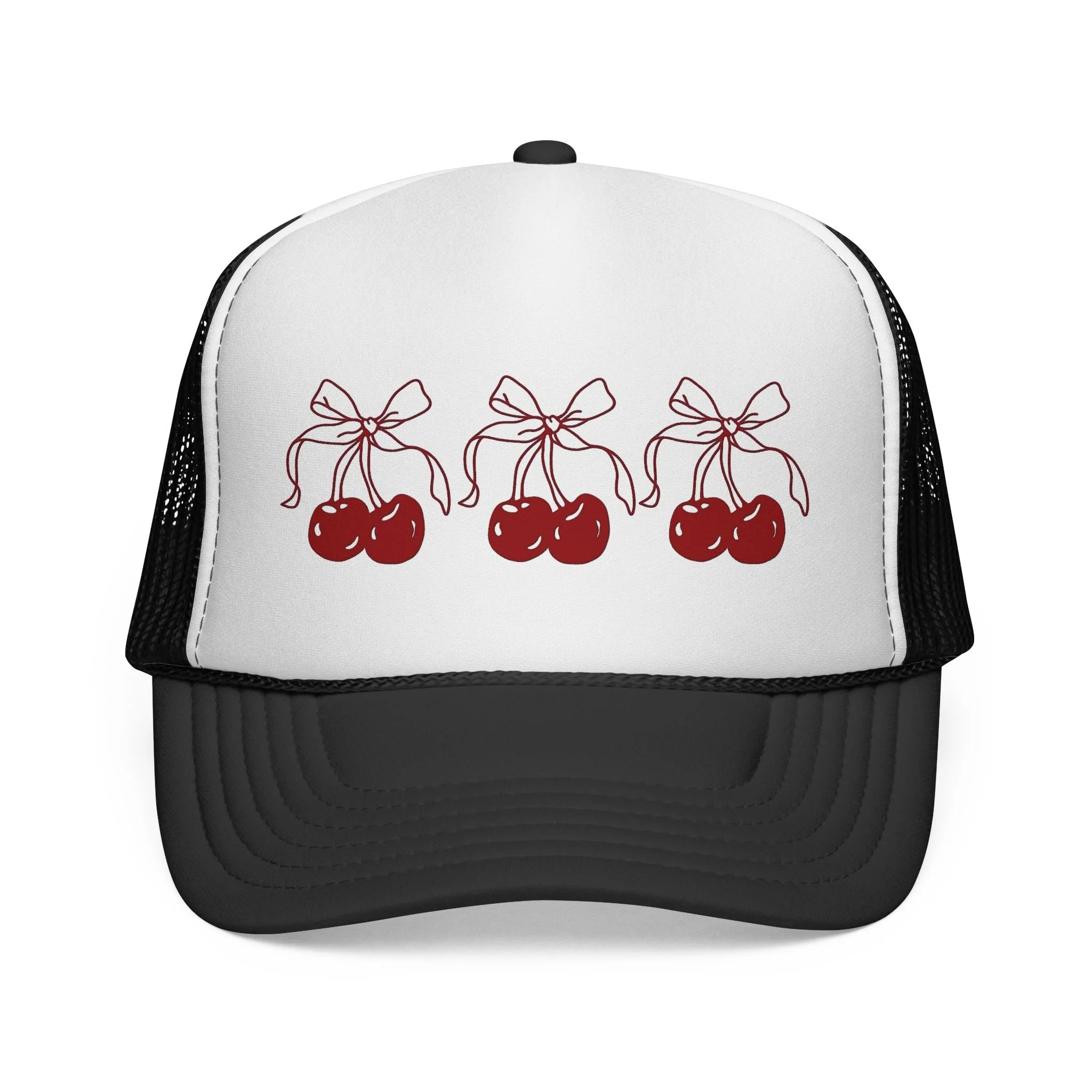 Cherry Trio Trucker Hat — Retro Ribbon Cherry Mesh Cap