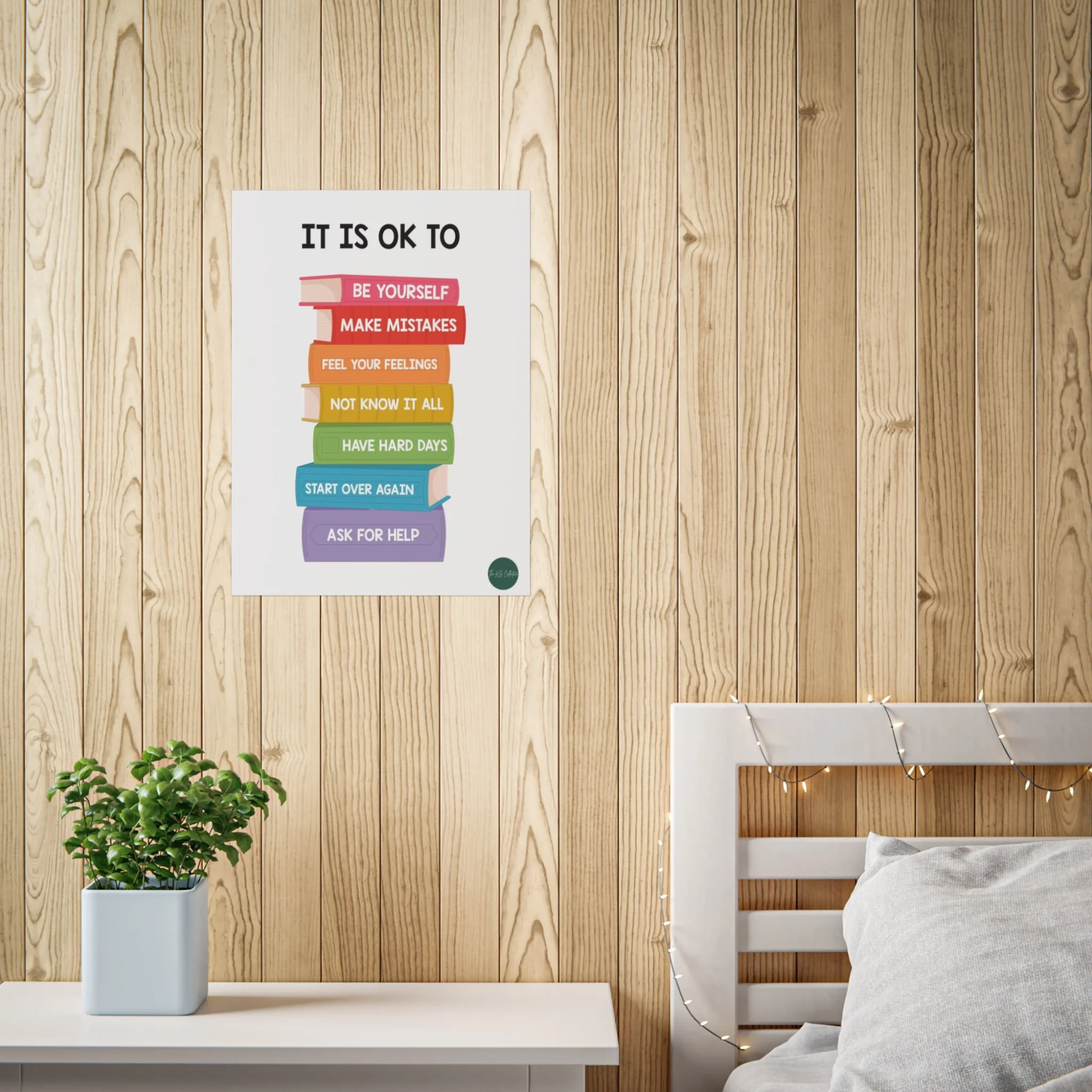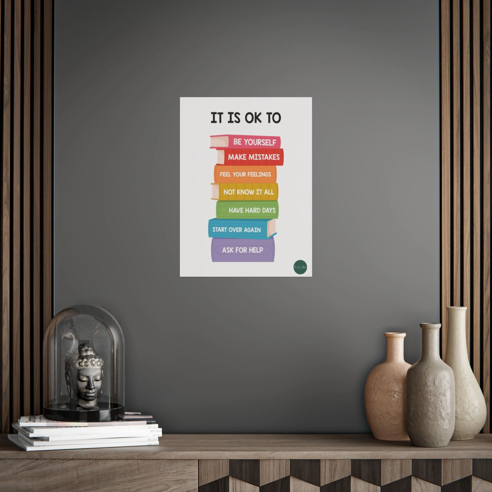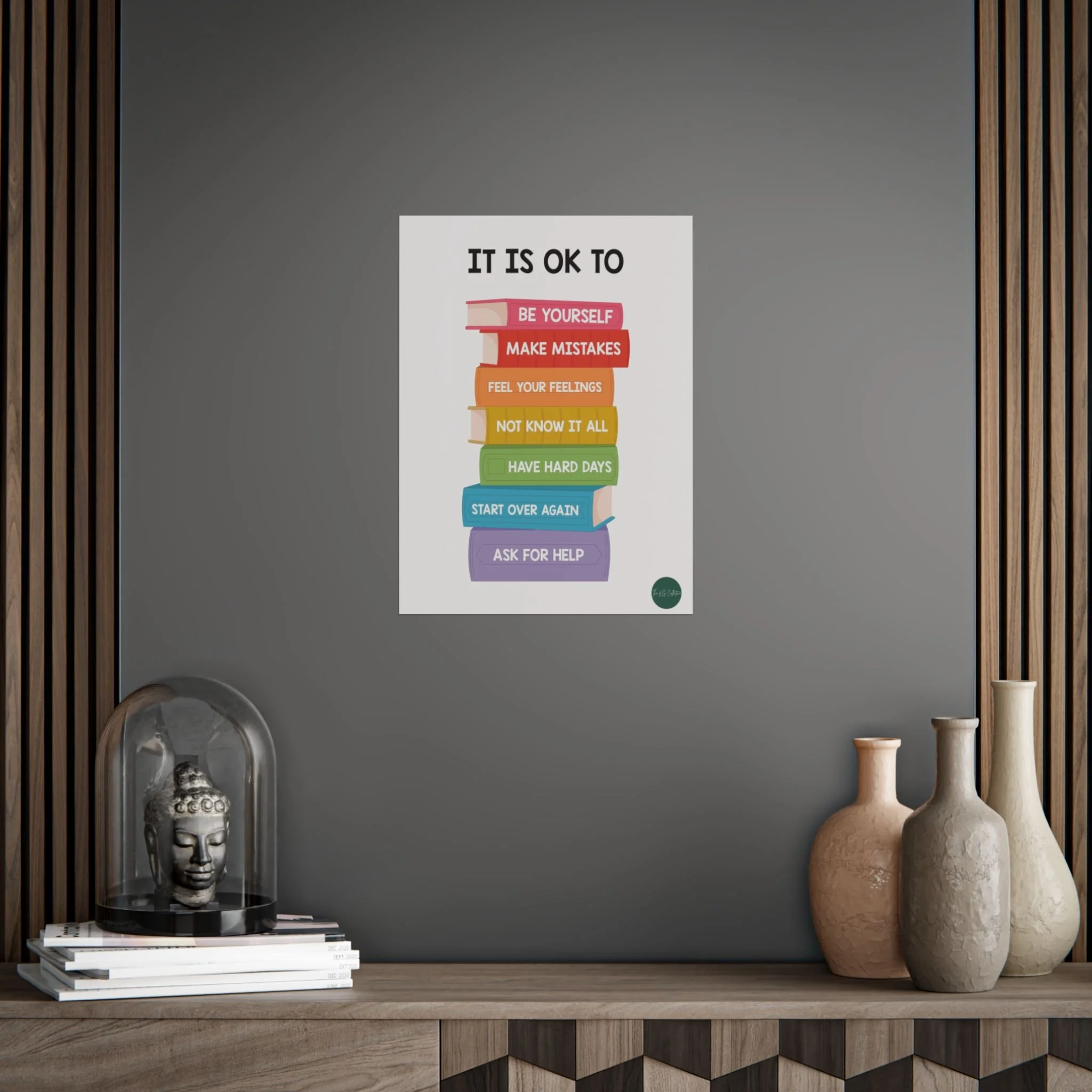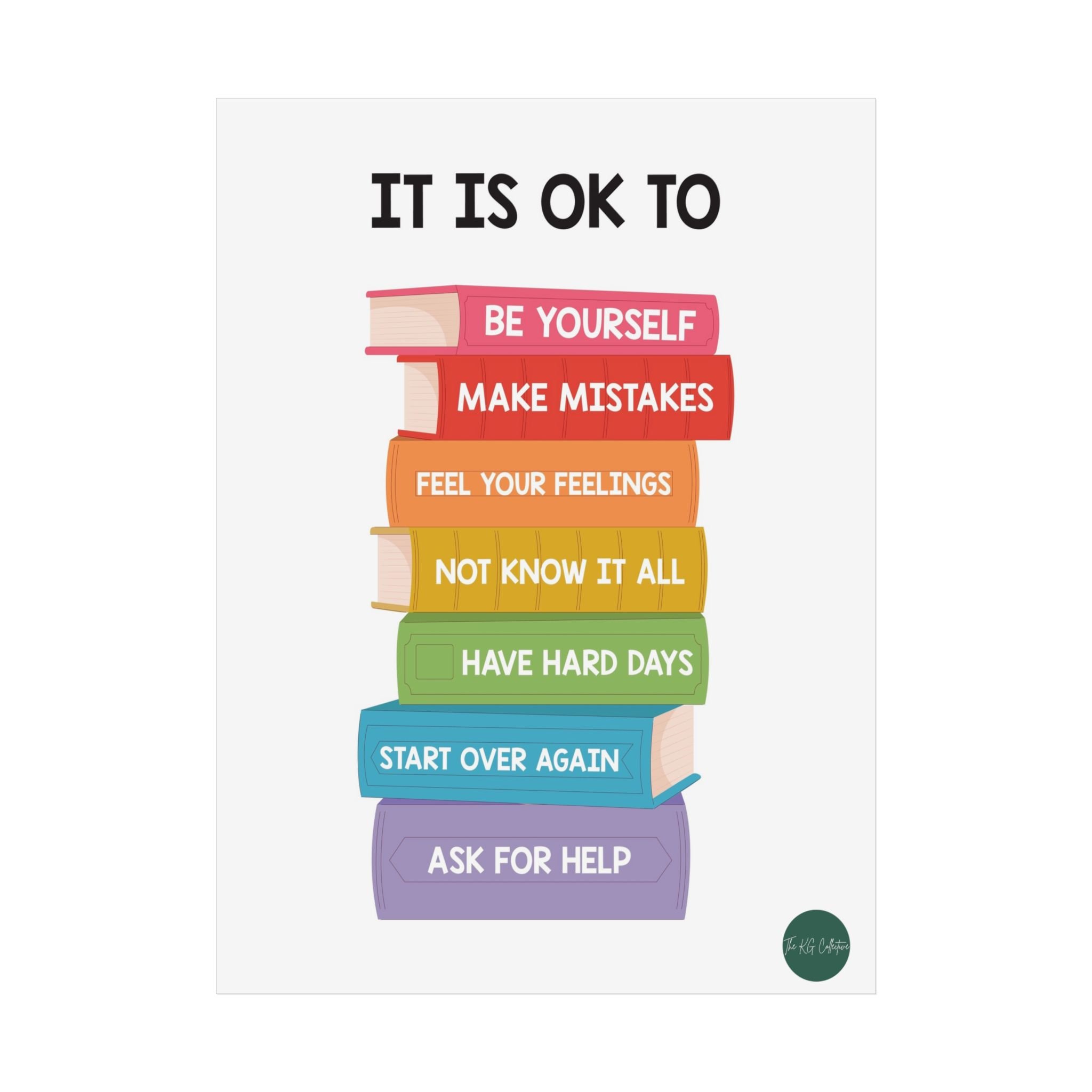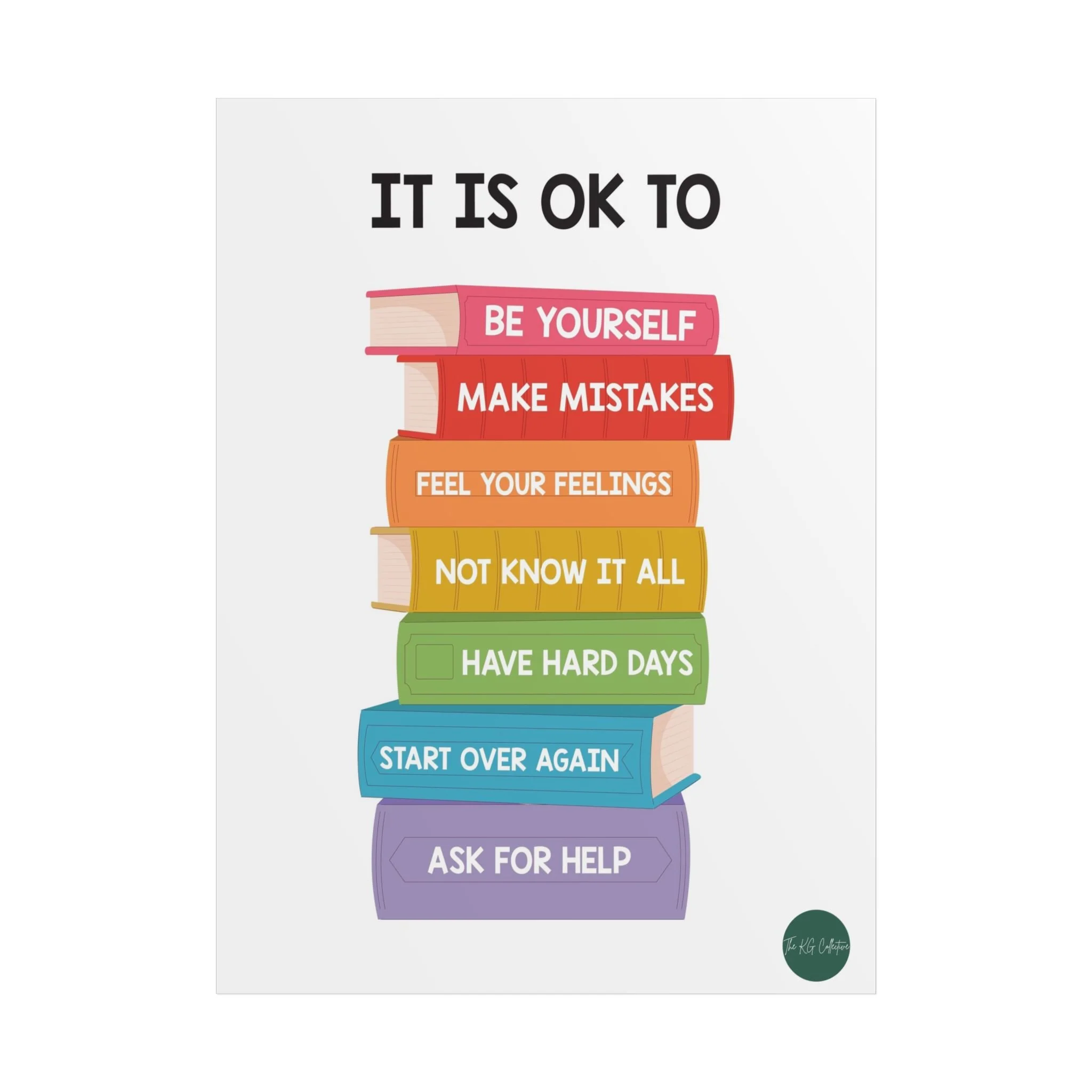 A bright, gentle reminder to breathe and be human. This poster stacks soft, rainbow-hued books with simple, compassionate messages — “Be yourself,” “Make mistakes,” “Ask for help” — presented in a clean, playful layout. It brings calm and encouragement to bedrooms, classrooms, counseling offices, or any wall that needs a quiet voice of support. The colors pop with crisp printing, but the choice of glossy or matte finish lets you tailor the mood: glossy for lively, reflective color; matte for a softer, muted look. Hang it vertically above a desk, beside a reading nook, or as part of a gallery wall to create a steady, reassuring presence in everyday life.