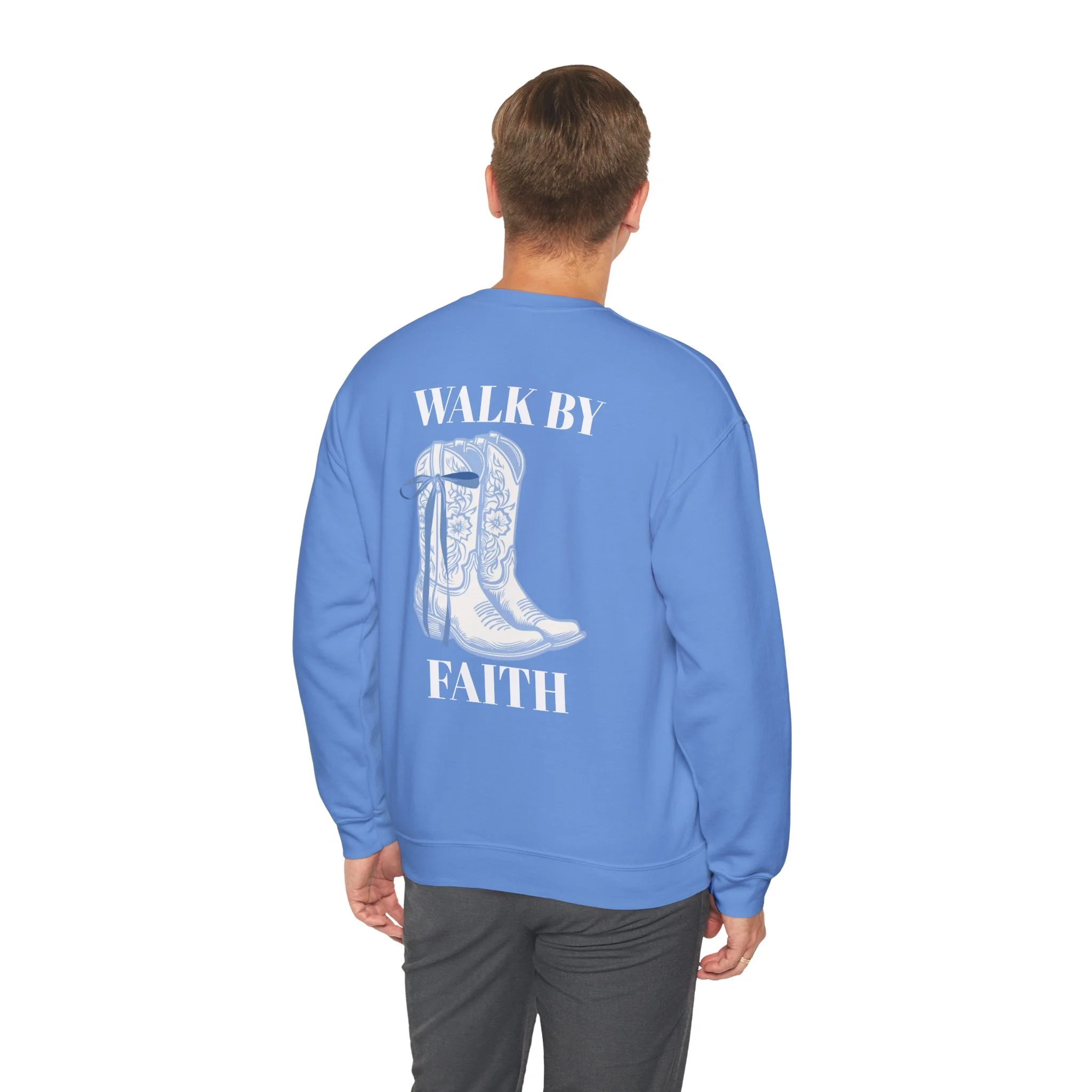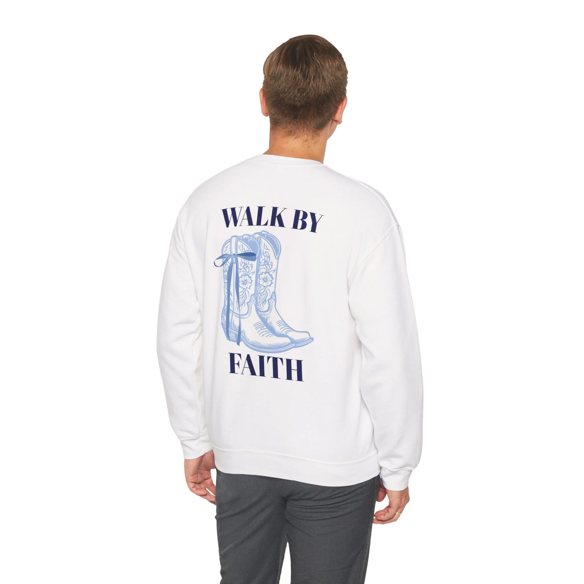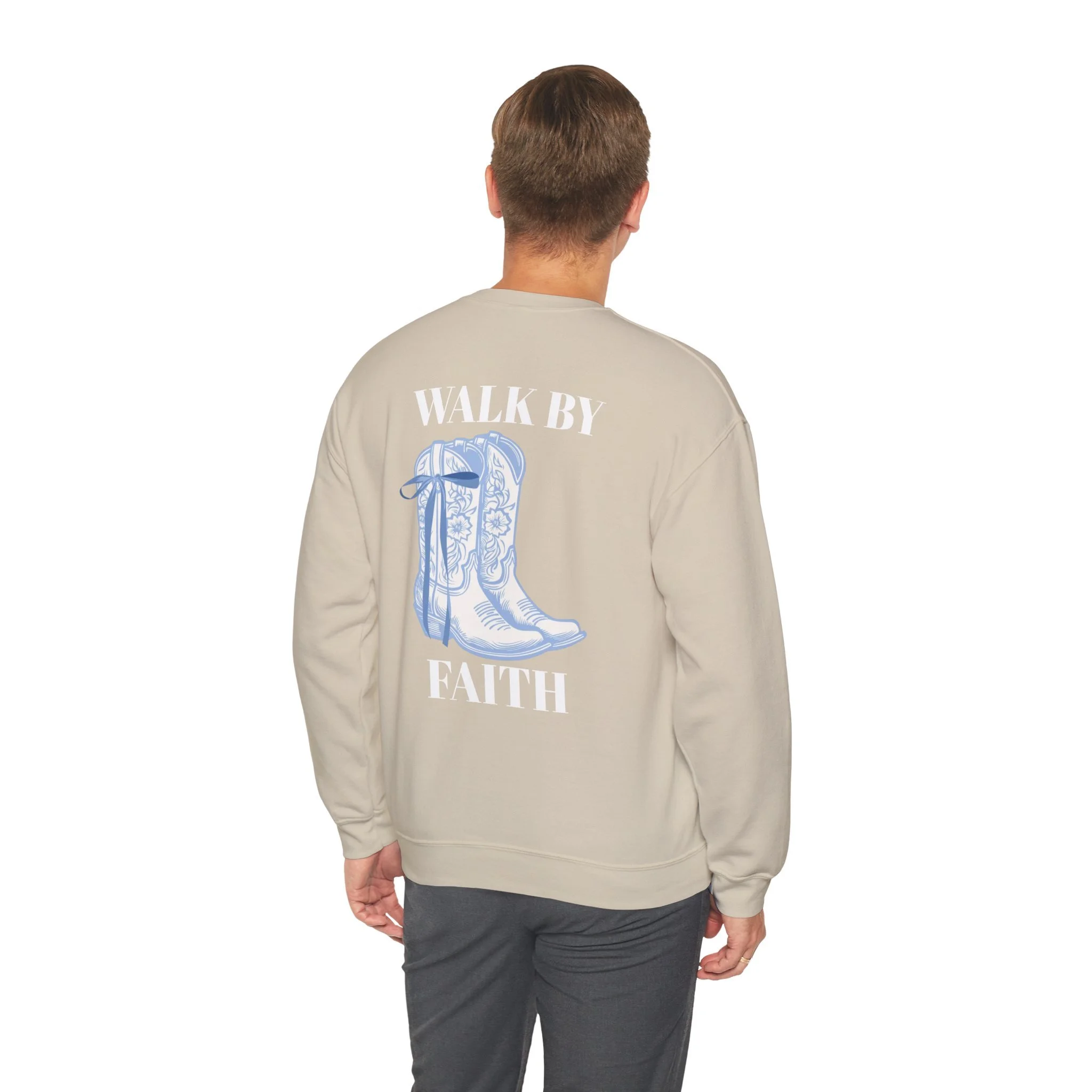 Walk By Faith Crewneck Sweatshirt — Christian Cowboy Boots Graphic