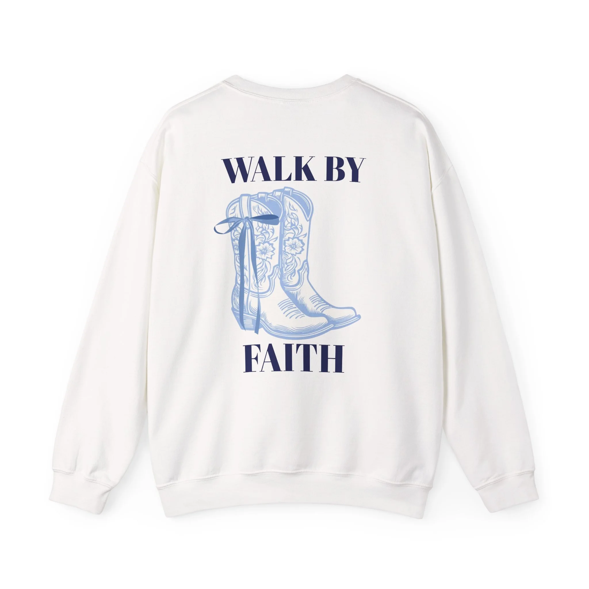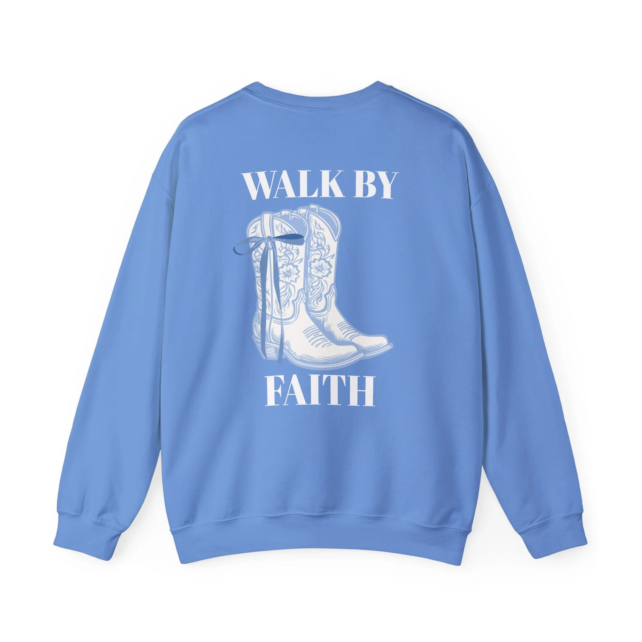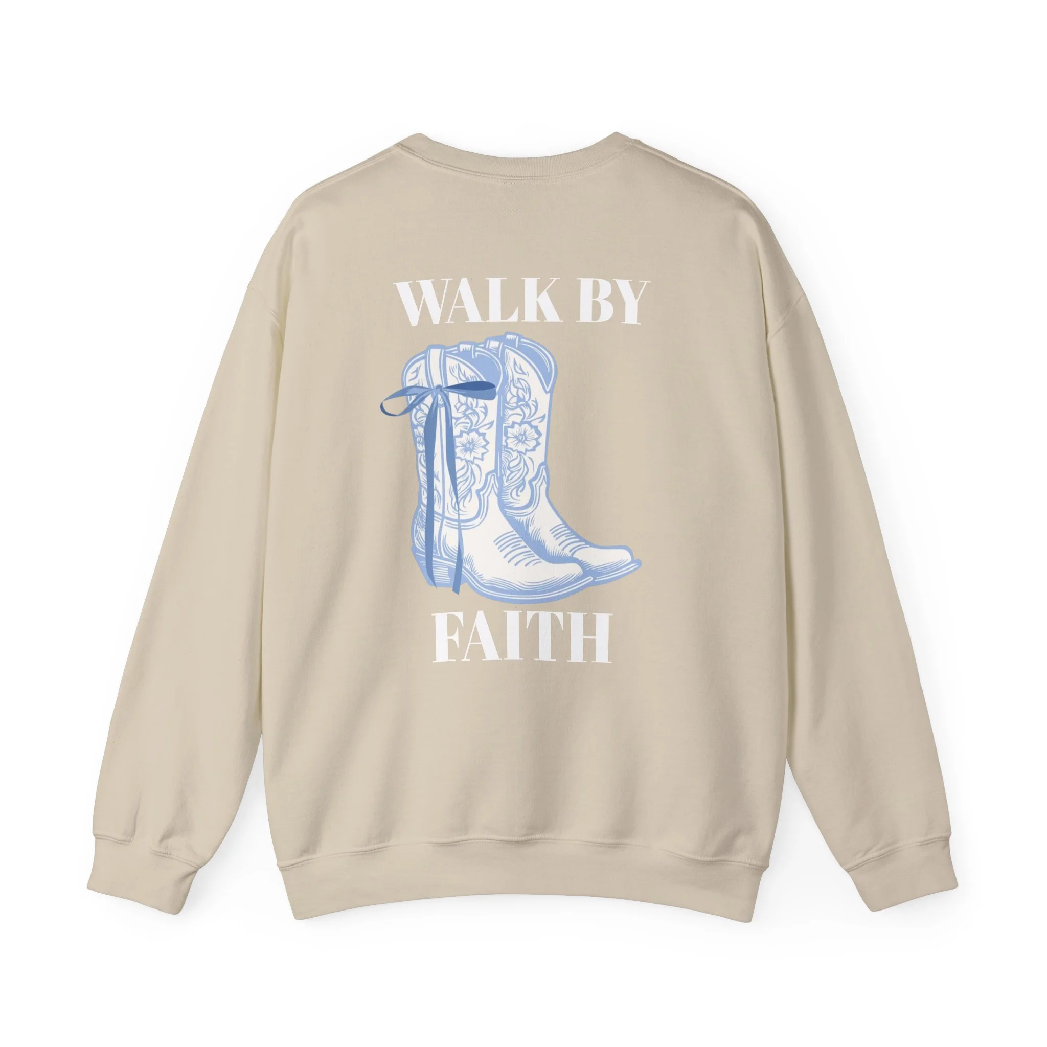 Walk By Faith Crewneck Sweatshirt — Christian Cowboy Boots Graphic