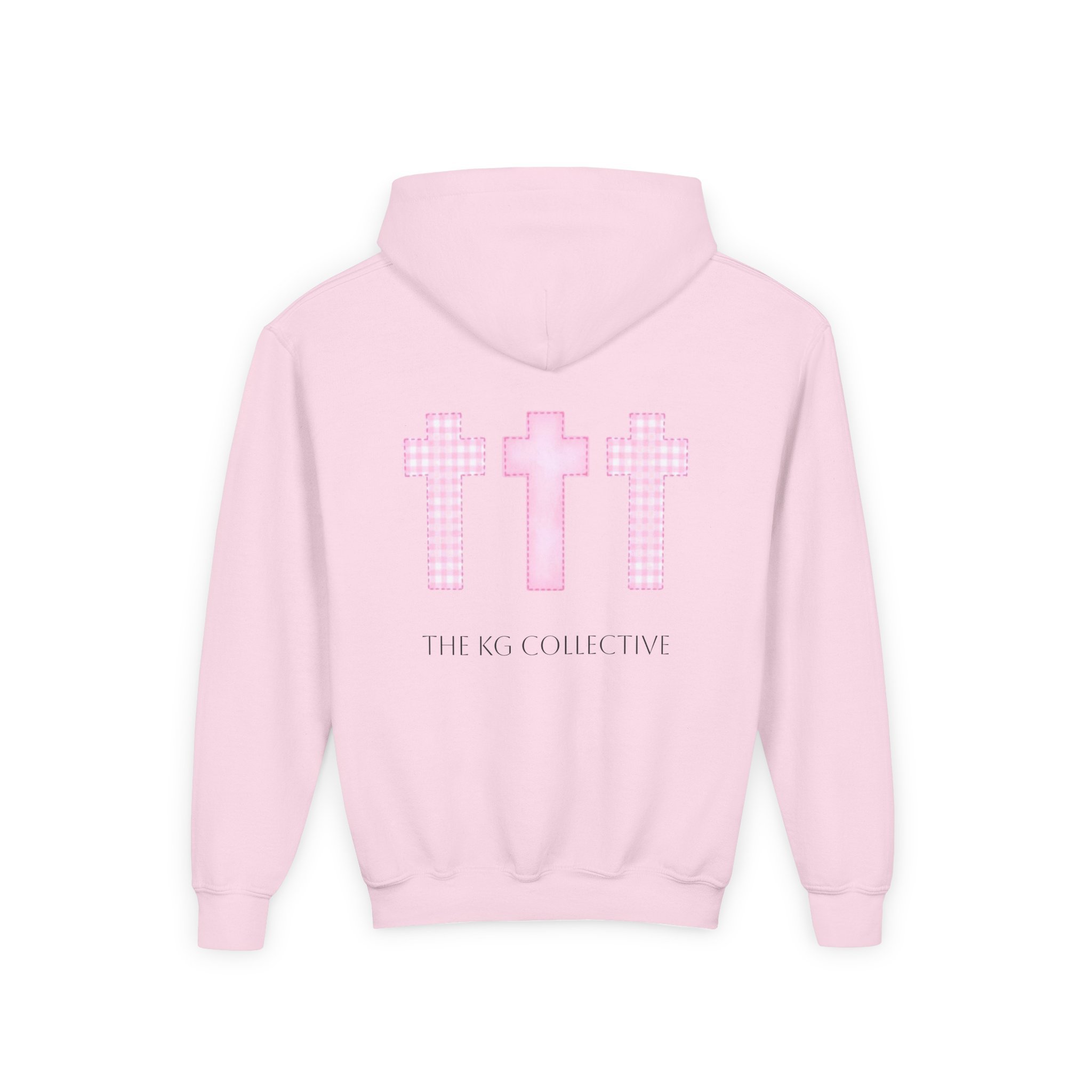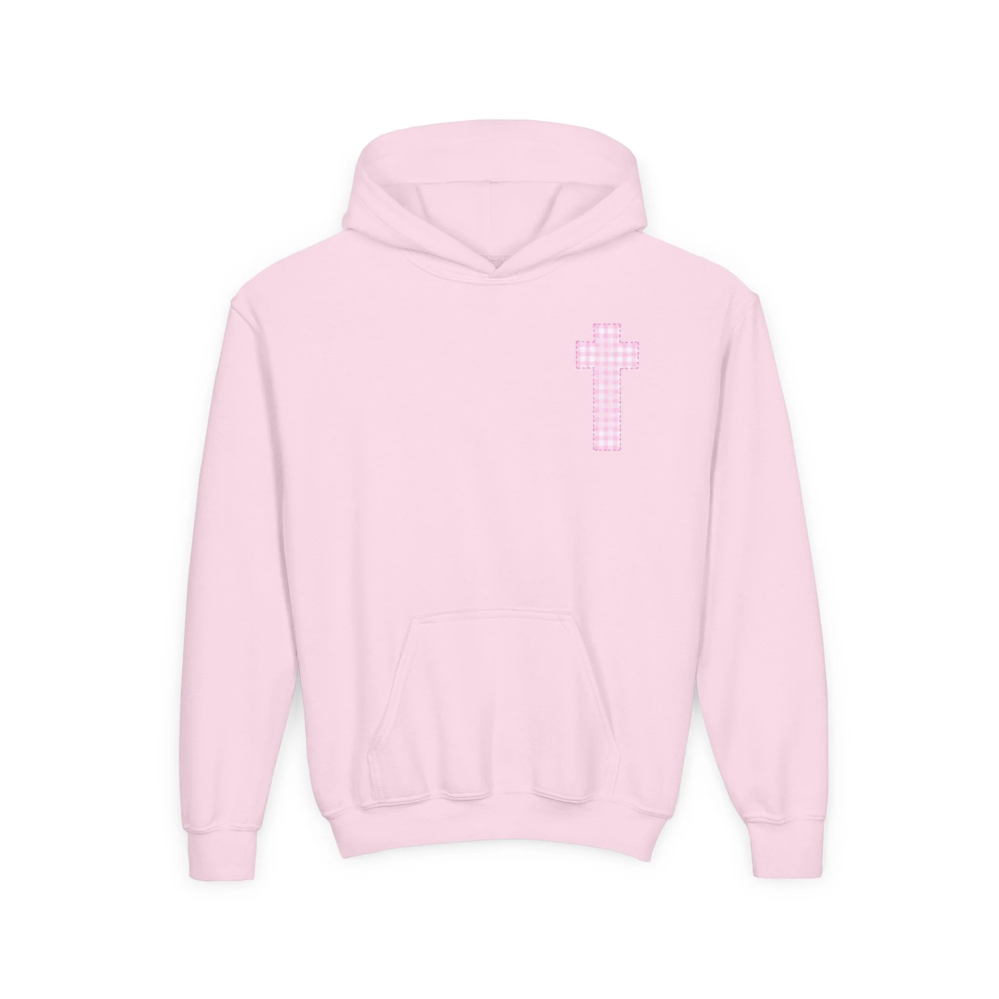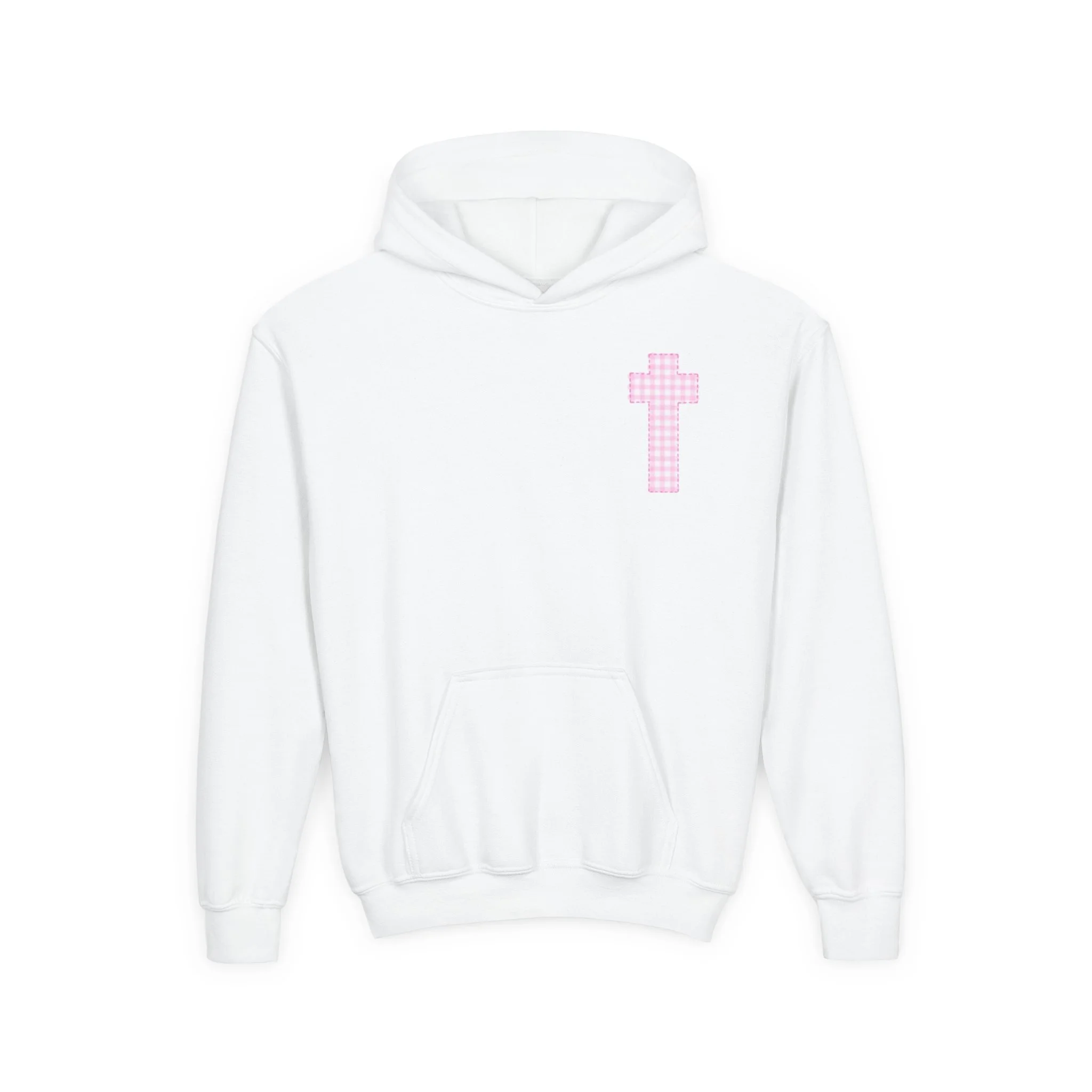 Soft, cozy, and quietly expressive — this youth hooded sweatshirt pairs everyday comfort with gentle faith-forward design. The medium-weight cotton/poly blend holds shape and color while staying soft against skin. A small pink cross sits over the heart; three matching crosses and a subtle brand line anchor the back, creating a calm, hopeful look that fits school days, Sunday routines, or relaxed weekends with family. The roomy kangaroo pocket keeps little hands warm and holds small treasures. Thoughtfully made with reinforced seams and safe materials, it’s a wearable reminder of care and calm for children.