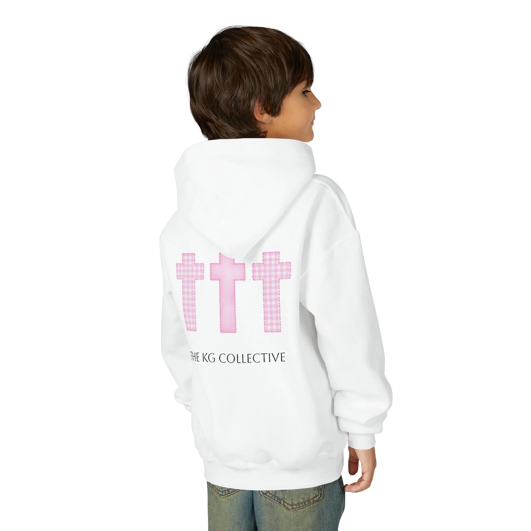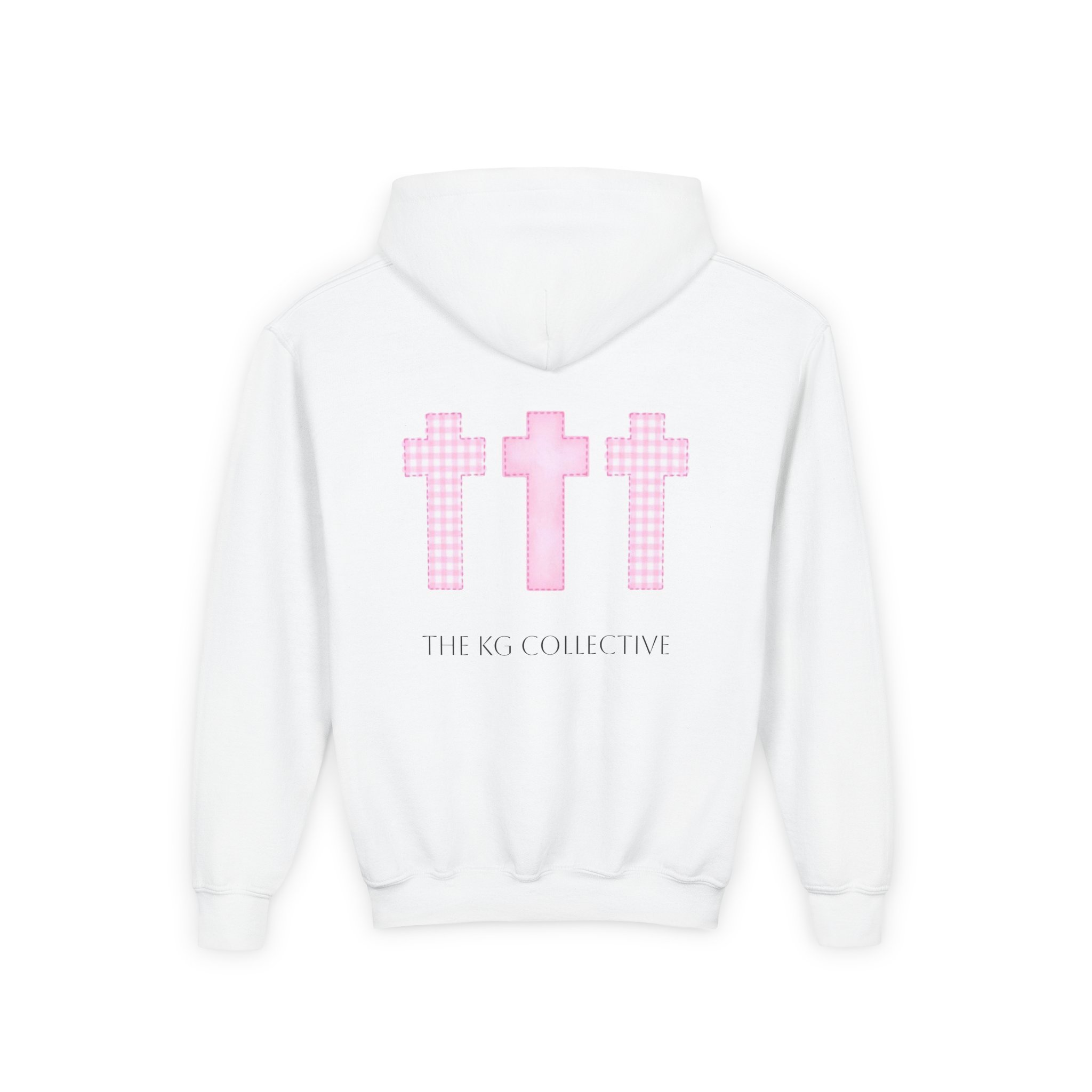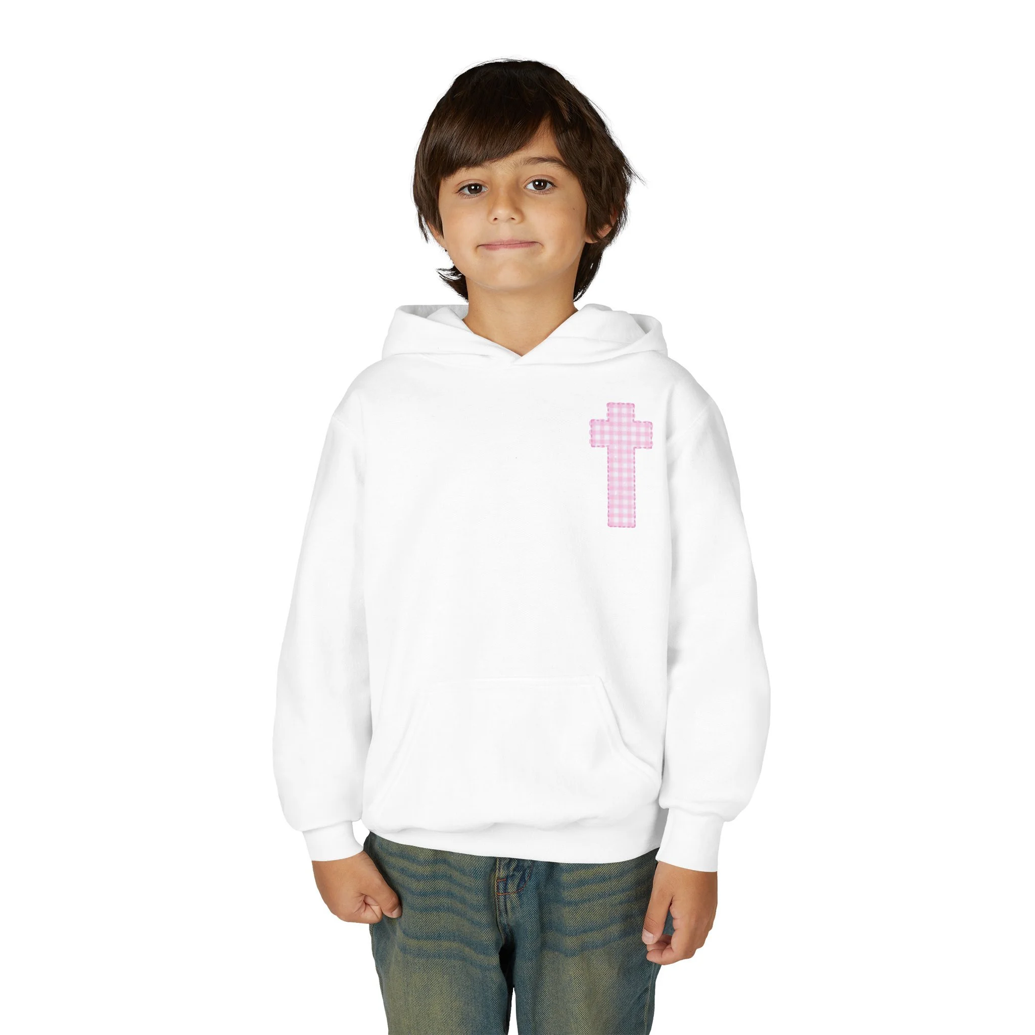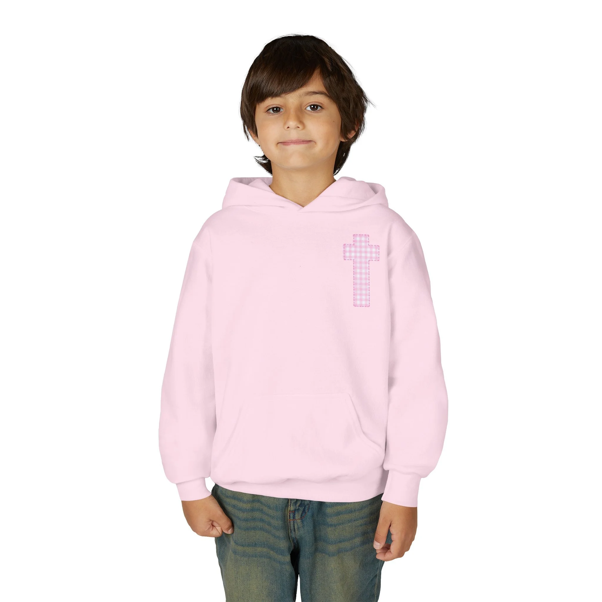 Soft, cozy, and quietly expressive — this youth hooded sweatshirt pairs everyday comfort with gentle faith-forward design. The medium-weight cotton/poly blend holds shape and color while staying soft against skin. A small pink cross sits over the heart; three matching crosses and a subtle brand line anchor the back, creating a calm, hopeful look that fits school days, Sunday routines, or relaxed weekends with family. The roomy kangaroo pocket keeps little hands warm and holds small treasures. Thoughtfully made with reinforced seams and safe materials, it’s a wearable reminder of care and calm for children.